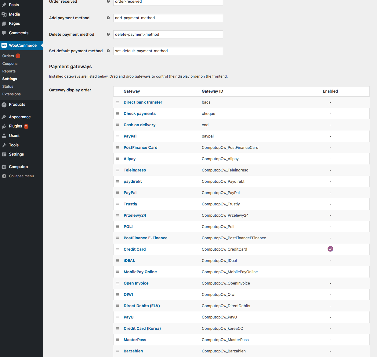Nutzen Sie das Potential von Computop in Ihrem WordPress WooCommerce Shop. Ihre Kunden profitieren von einer Vielzahl an nationalen und internationalen Zahlungsmethoden. Zusätzlich zu Kreditkarten umfasst das Payment-Portfolio Debitkarten, eWallets und Online-Überweisungen. Eine detaillierte Liste der enthaltenen Zahlarten gibt es hier.
