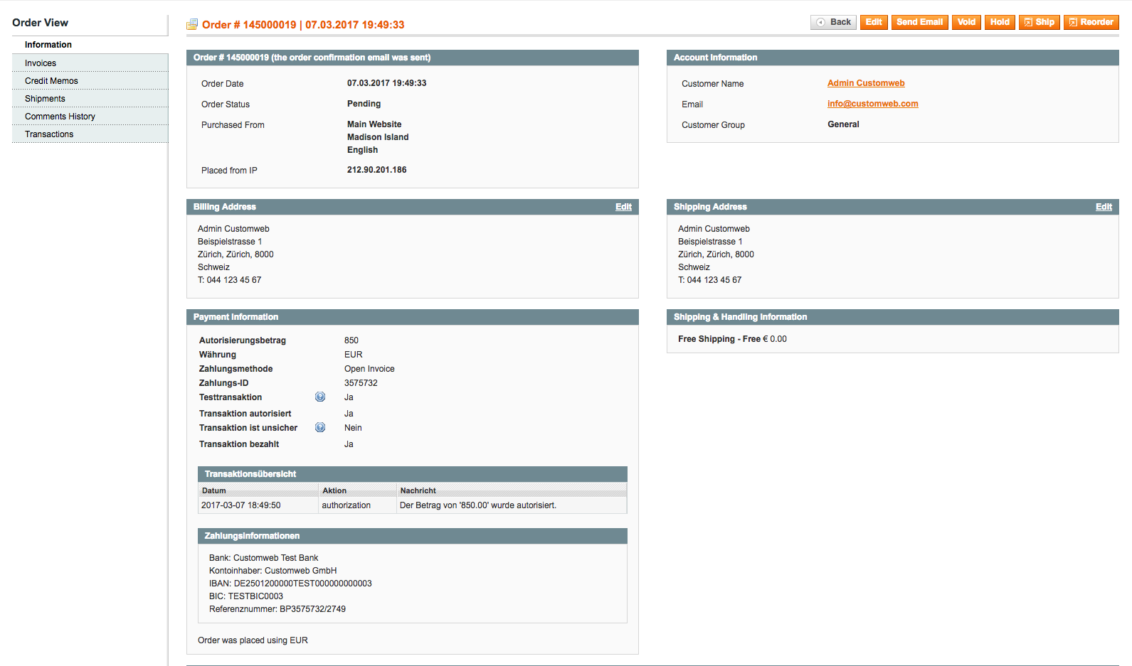 Customer ID customer1 Company Must be empty Gender FEMALE Firstname Test Lastname Tester Strasse Schwarzenbergstrasse 4 Post Code 96050 City Bamberg Land DE Phone +49(5664)111111 E-Mail Betrag under €300 Birthday 1987-10-25 | Paymorrow: PrepareOrder ACCEPTED ConfirmOrder ACCEPTED |