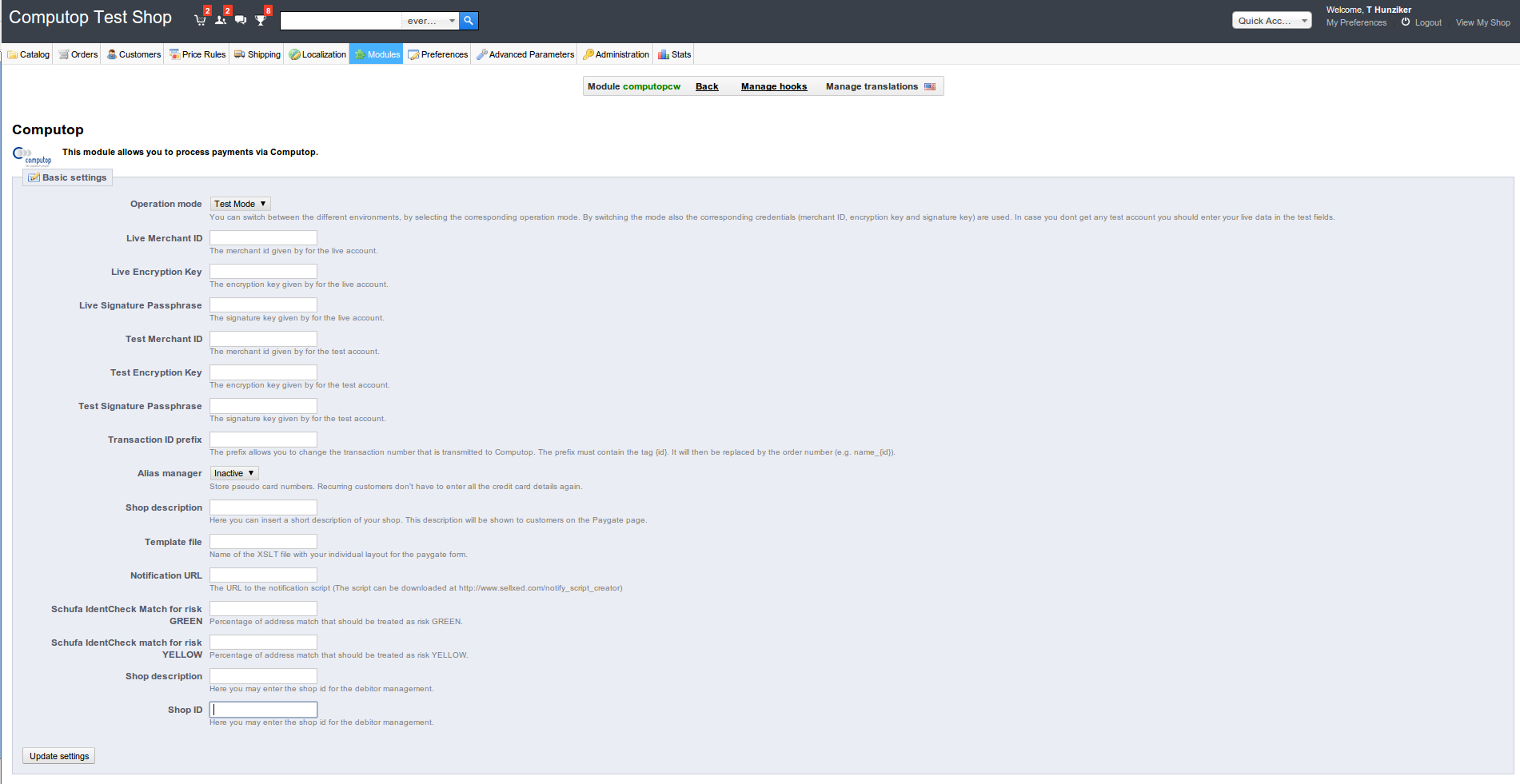 By purchasing the Computop Cartridge for PrestaShop you gain, additionally to the software license, extensive support services. In order to guarantee the security, functionality and compatibility of the payment processing we continually release updates and upgrades. You are granted access to the latest versions during 12 months after purchase. In case you encounter problems with the integration or with the running system, we offer you support by phone or e-mail. Optionally, you can also use the installation service of customweb ltd (entire configuration of the module in the shop as well as with Computop). This service can also be ordered at later date.