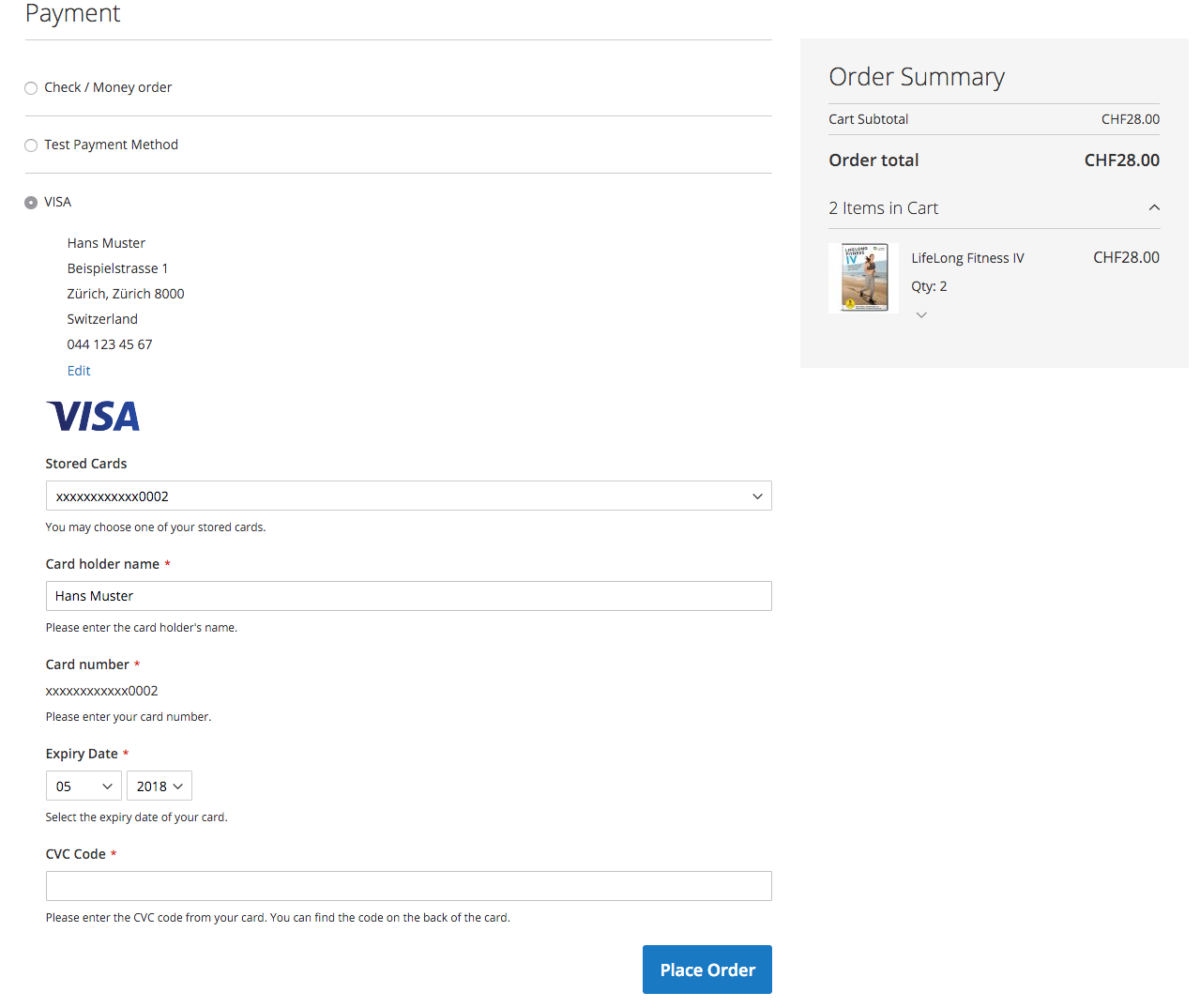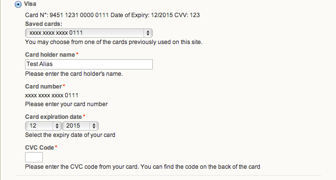 Kartennummer 4000012892688323 Expiry Date 12/2020 CVC 123 | Visa |
