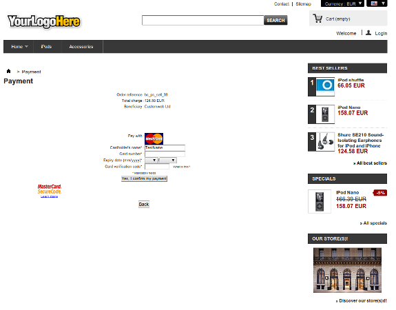 Pour l'intégration, vous avez le choix d'une pré-sélection dans la boutique; c'est à dire que le client choisit le type de carte déjà dans la boutique; ou une intégration générique dans ce cas, le client verra que l'option «carte de crédit» comme méthode de paiement, puis choisira le type de carte sur la page de paiement Concardis PayEngine.