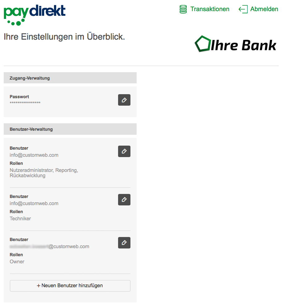 Melden Sie sich bei https://sandbox.paydirekt.de/merchant/ mit den erhaltenen Zugangsdaten an. Unter "Einstellungen > Benutzerverwaltung" können Sie einen neuen Benutzer hinzufügen respektive die Rechte bestehender Benutzer anpassen. Fügen Sie einen neuen Benutzer hinzu oder stellen Sie sicher, dass Ihr Owner Account die Rollen Reporting, Rückabwicklung, Techniker enthält.