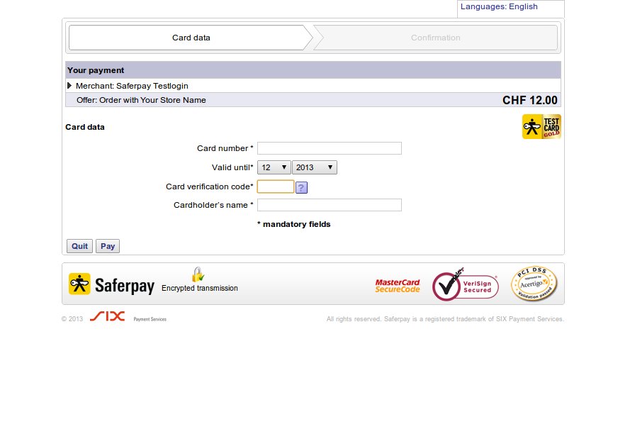 • Saferpay Secure Card Data - you can save the payment data at 100% PCI conformity and you do not need to fill in the information again (Saferpay business license needed)