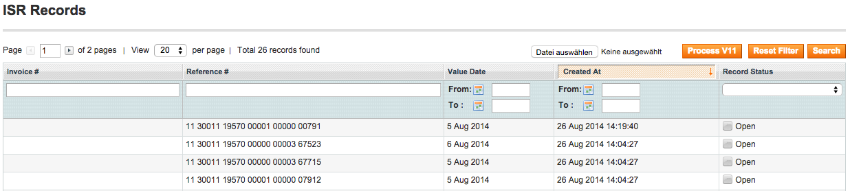 Erhaltene Zahlungen können automatisiert über das Einlesen von .v11 Dateien abgewickelt werden. Diese erhalten Sie täglich von Ihrem Finanzinstitut. Gehen Sie zu Verkäufe > ESR Belege und wählen Sie unter „Durchsuchen“ Ihre heruntergeladene .v11 Datei und klicken Sie „V11 Verarbeiten“. Nach kurzer Zeit sehen Sie in einer Liste die eingelesenen Zahlungen. Diese können vier Zustände haben.