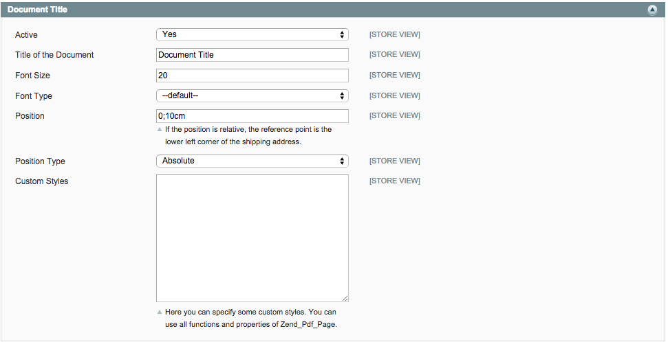 Die PDF-Extension funktioniert nach dem Prinzip der Vorlagen-Vererbung. Konfigurieren Sie in der Standardvoralge das Dokument gemäss Ihren Vorstellungen. Sie können dann jeweils für die Lieferschein-, Rechnungs-, und Mahnvorlage die abweichenden Elemente anpassen, ansonsten wird automatisch auf die Standardvorlage zurückgegriffen. Die Einstellungen zur PDF-Vorlage finden Sie unter System > Konfiguration > PDF Vorlagen. Jedes Element im PDF kann angepasst werden. Informationen zu den einzelnen Formatoptionen werden im nächsten Kapitel ausgeführt.