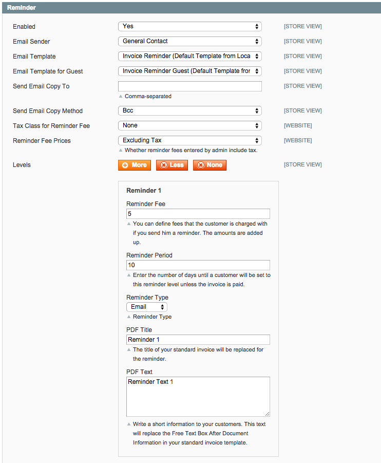 • Mahntyp: E-Mail: Die Mahnung wird als E-Mail versendet. Die E-Mail Vorlage können Sie gemäss dem Magento-Standard unter System > Transaktions-Emails anpassen.