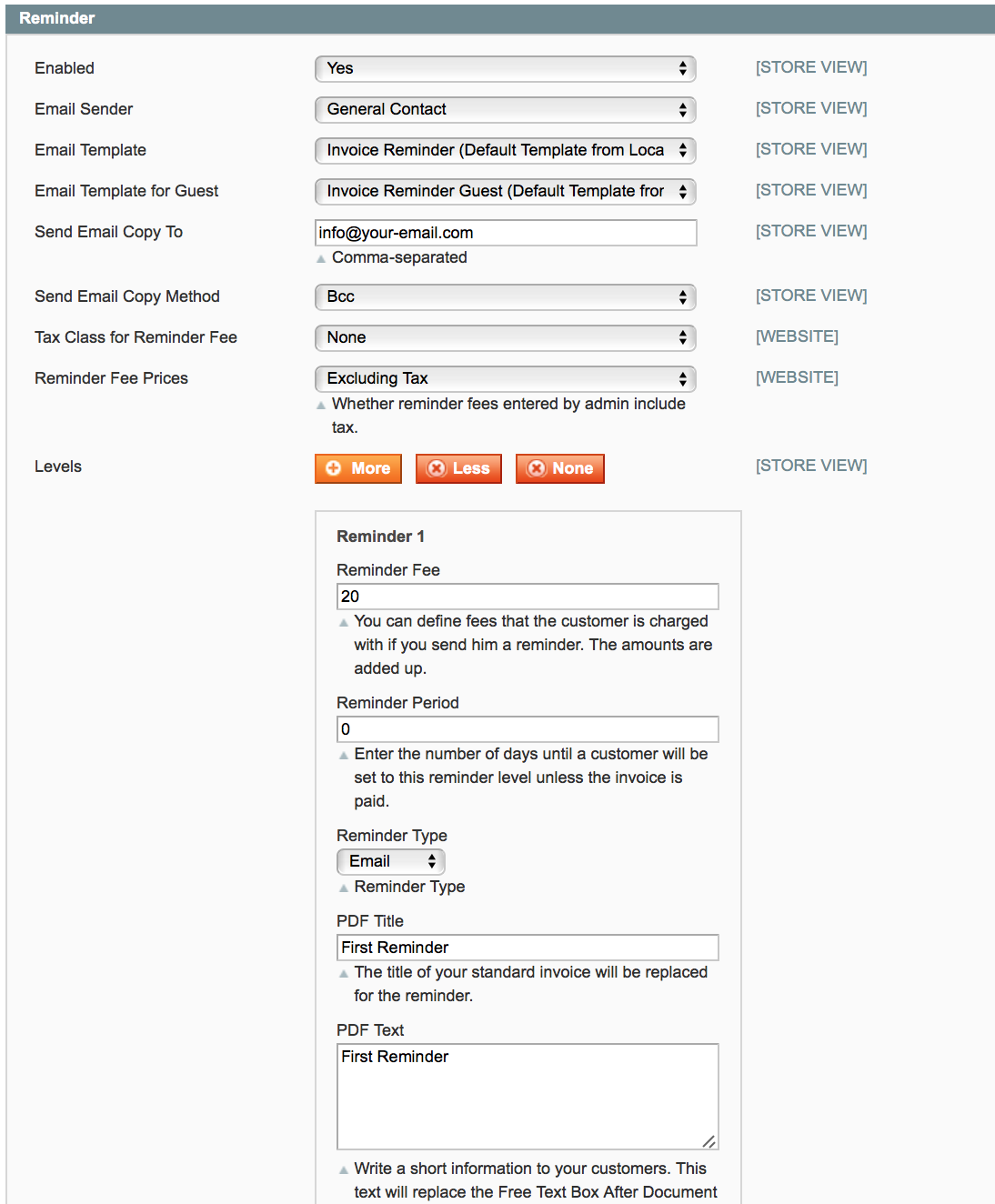 - Mahntyp: E-Mail: Die Mahnung wird als E-Mail versendet. Die E-Mail Vorlage können Sie gemäss dem Magento-Standard unter System > Transaktions-Emails anpassen.