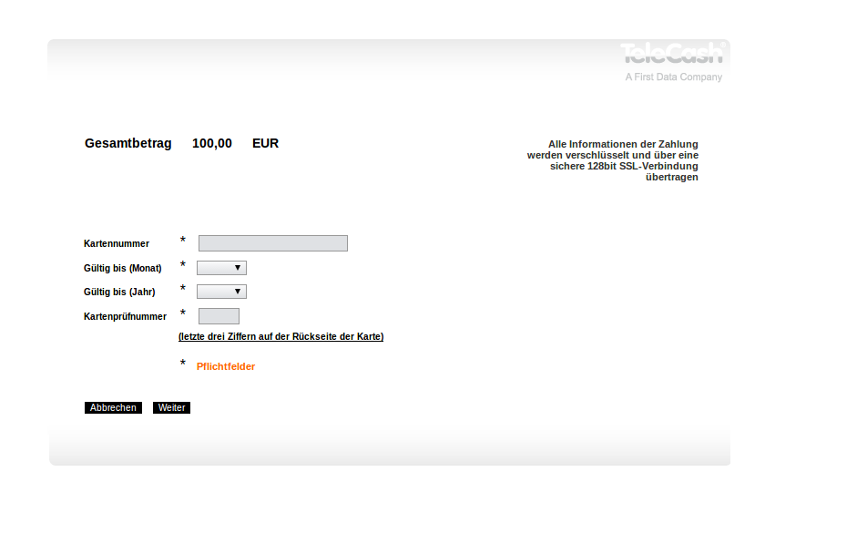 - Data Storage: the customer's credit card data can be stored with Telecash from fiserv and used for later purchases